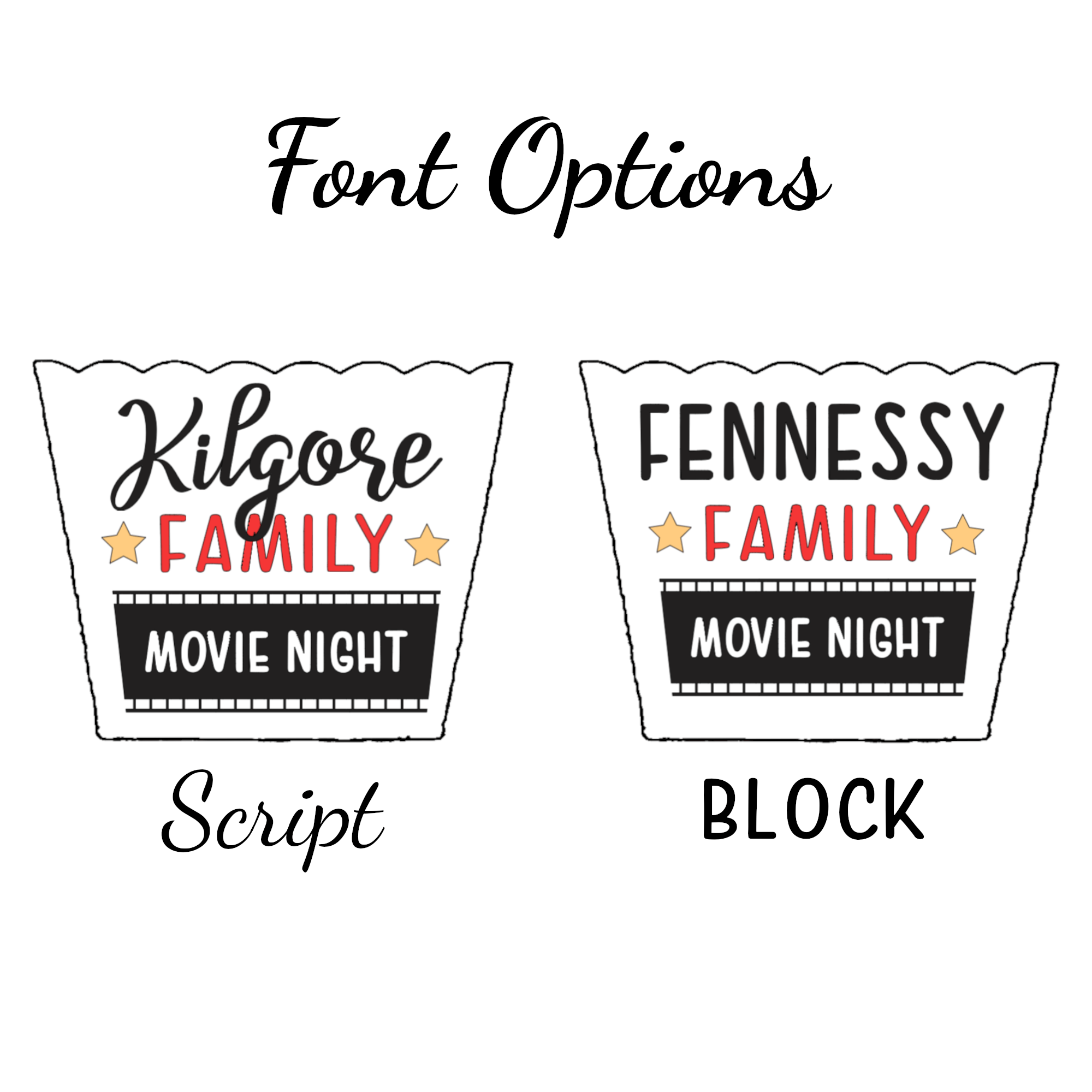 • 🍿 1 Large Flexible Plastic Popcorn Bowl (8.5" L × 6.5" W × 6.75" H) – Personalized with your family name (e.g., Miller Family Movie Night) in premium permanent vinyl.