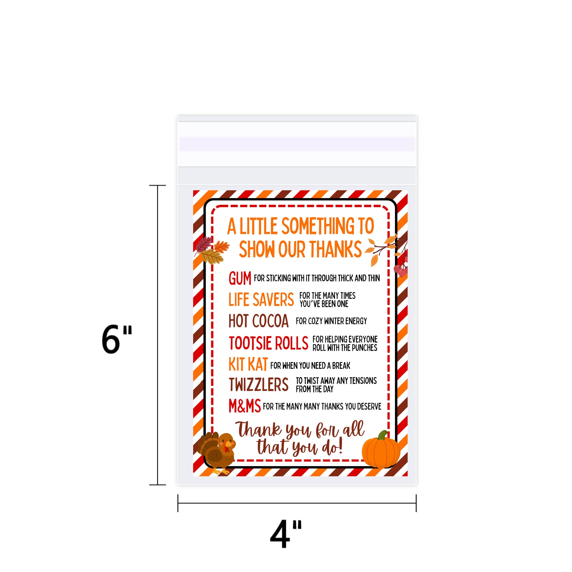 Our Fall Staff Appreciation Kit is a thoughtful way to say “thank you” to teachers, coworkers, employees, or volunteers. Each candy includes a special message of appreciation, making this small gesture both fun and meaningful.
